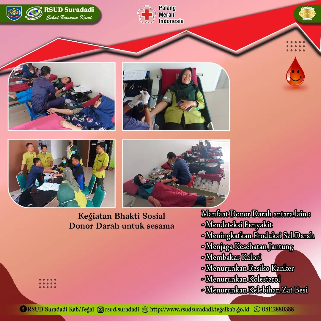 RSUD Suradadi kembali melaksanakan kegiatan donor darah rutin yang diikuti oleh Civitas Hospitalia serta masyarakat sekitar rumah sakit. Kegiatan kemanusiaan ini merupakan hasil kerja sama antara RSUD Suradadi dan Palang Merah Indonesia (PMI) Kabupaten Tegal, yang telah menjadi agenda rutin setiap tiga bulan sekali.